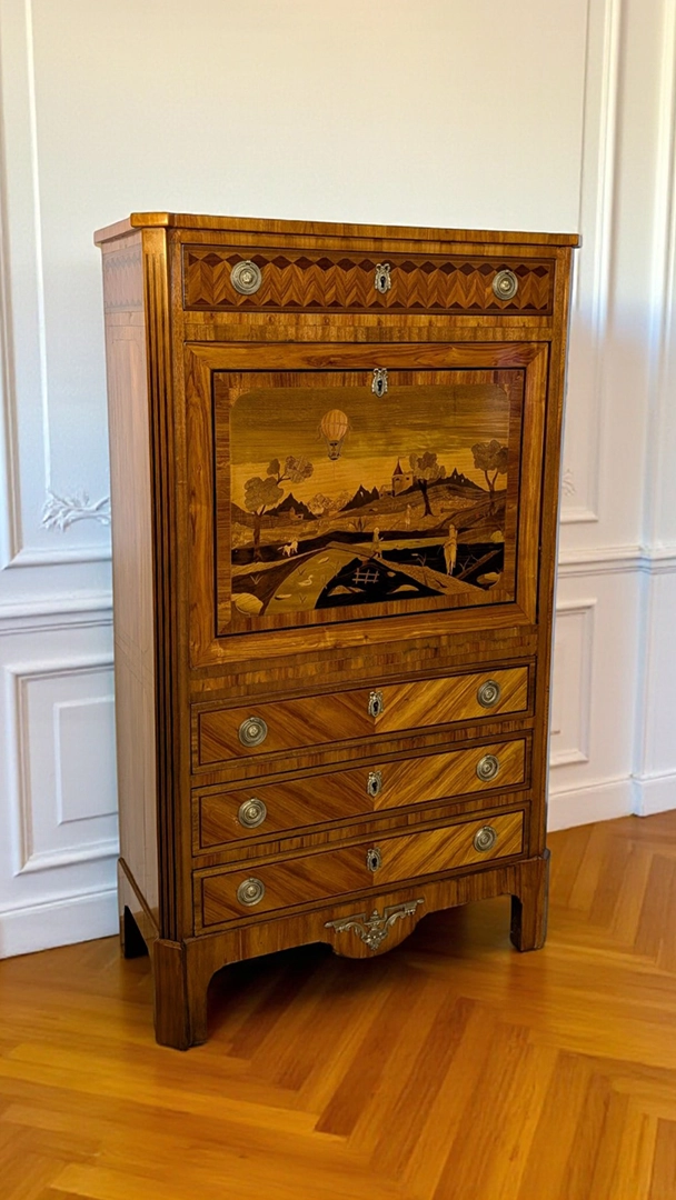 Dieser elegante Sekretär ist ein Meisterwerk klassischer Handwerkskunst, vermutlich aus dem 18. oder frühen 19. Jahrhundert. Das Möbelstück besticht durch seine aufwendige Intarsienarbeit auf der zentralen Klappe, die eine ländliche Szenerie mit einem Heißluftballon, Bäumen, einem Flusslauf und einem Schloss im Hintergrund zeigt. Solche Motive deuten auf eine romantische Epoche und viel Liebe zum Detail hin.