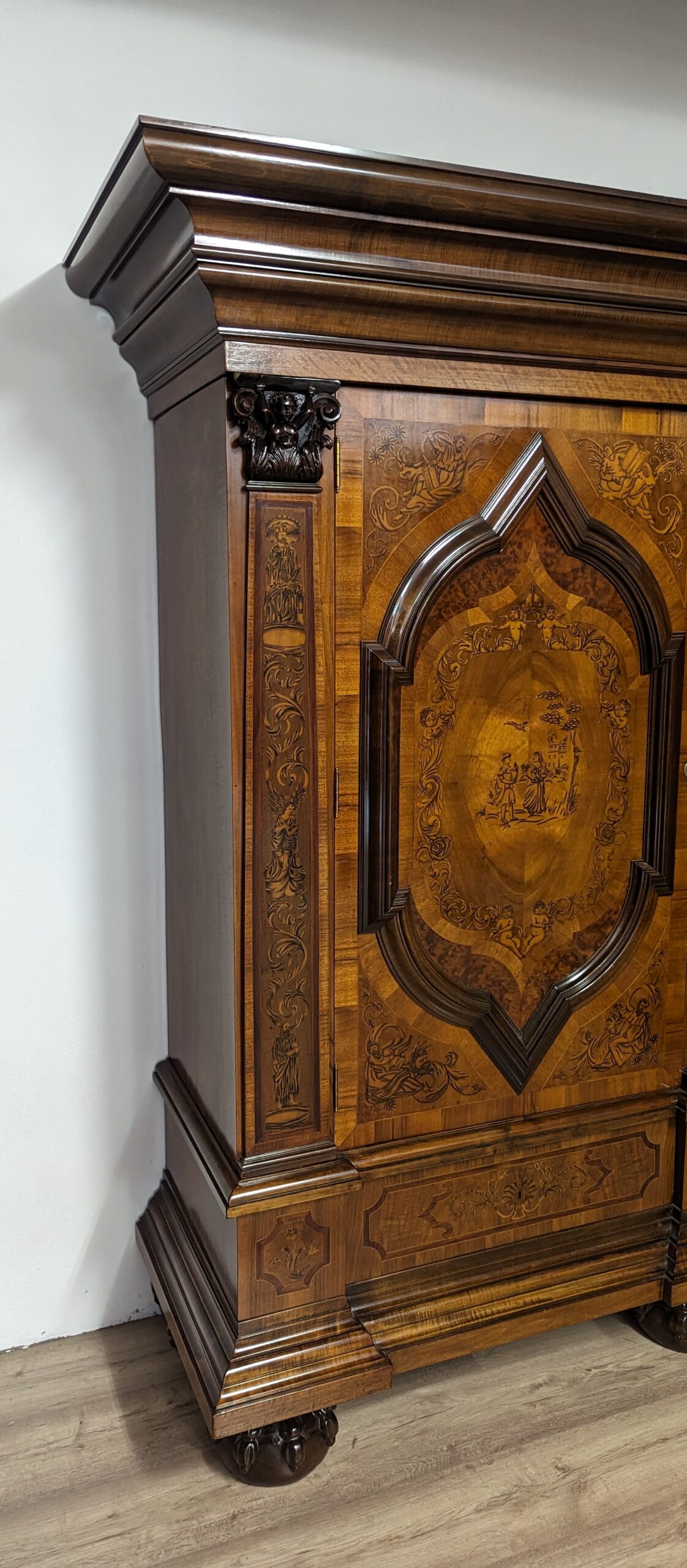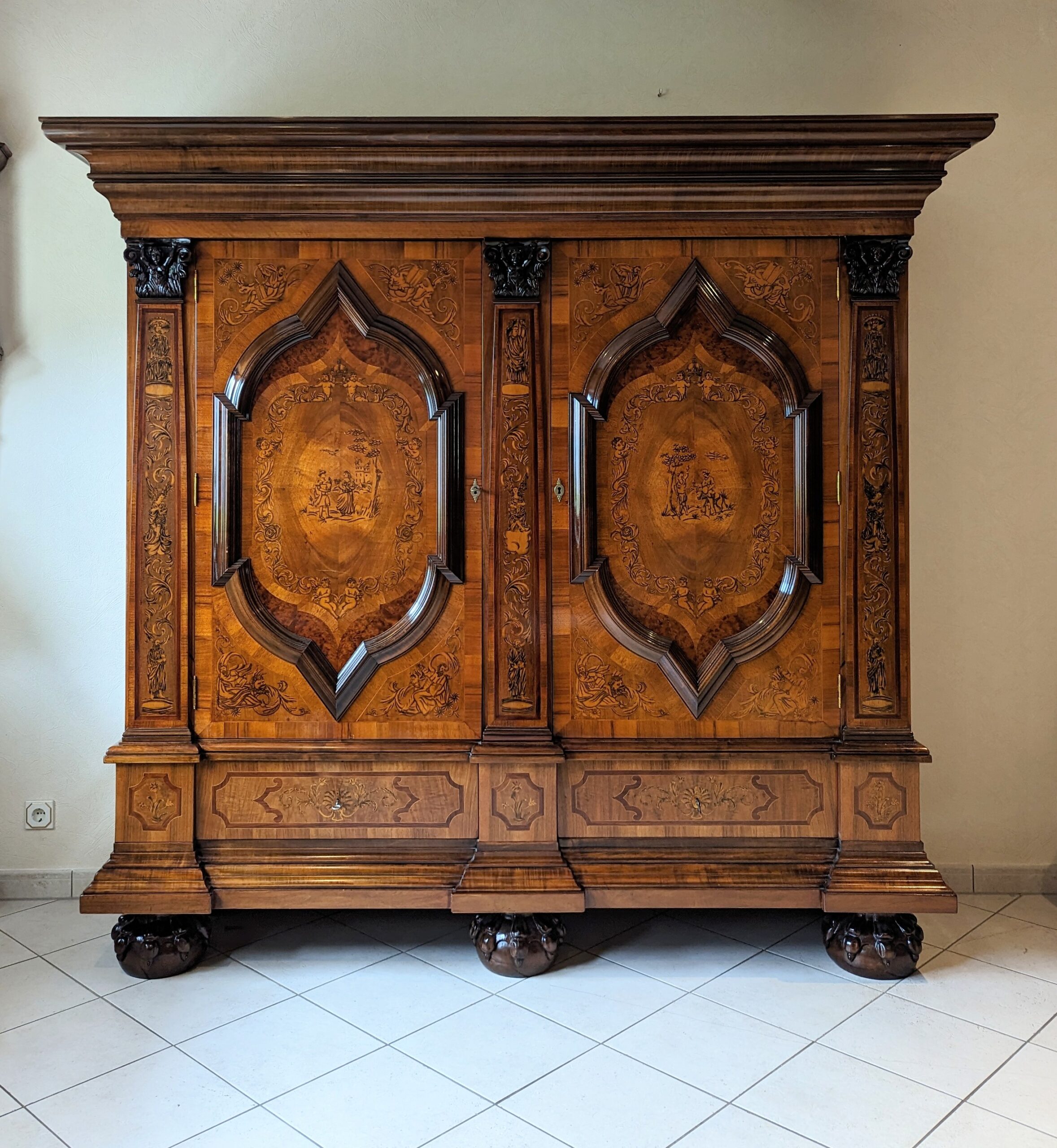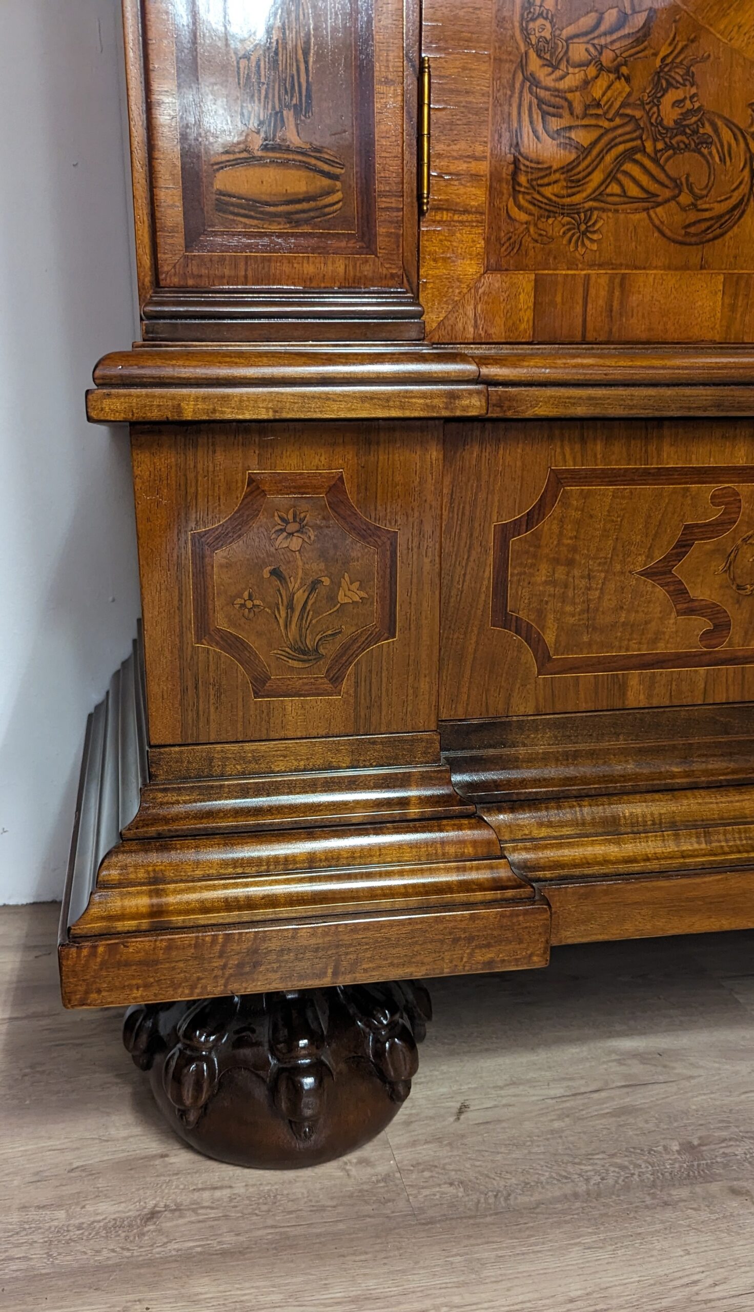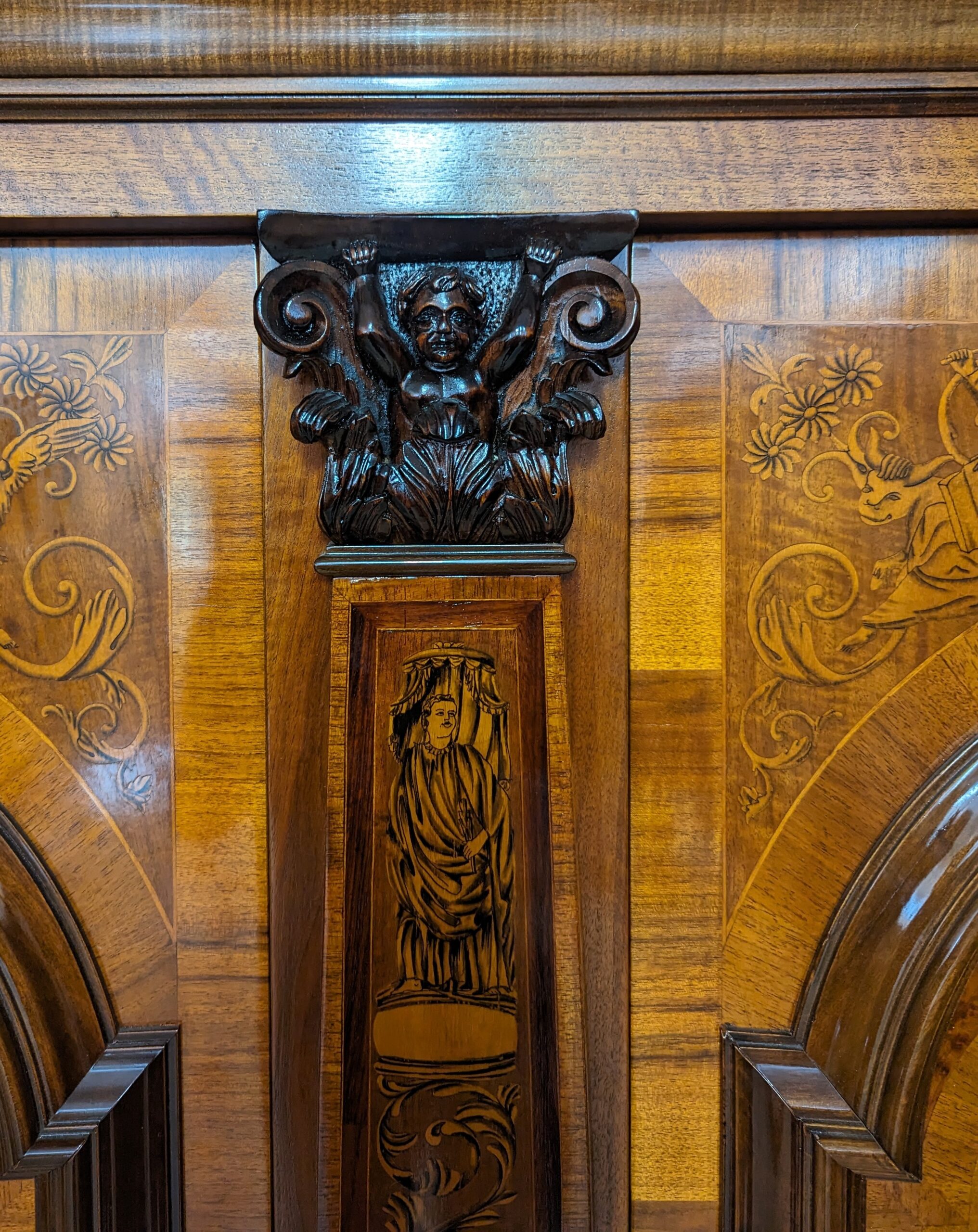 Der Schrank besitzt schöne Brandmalereien und Intarsien.