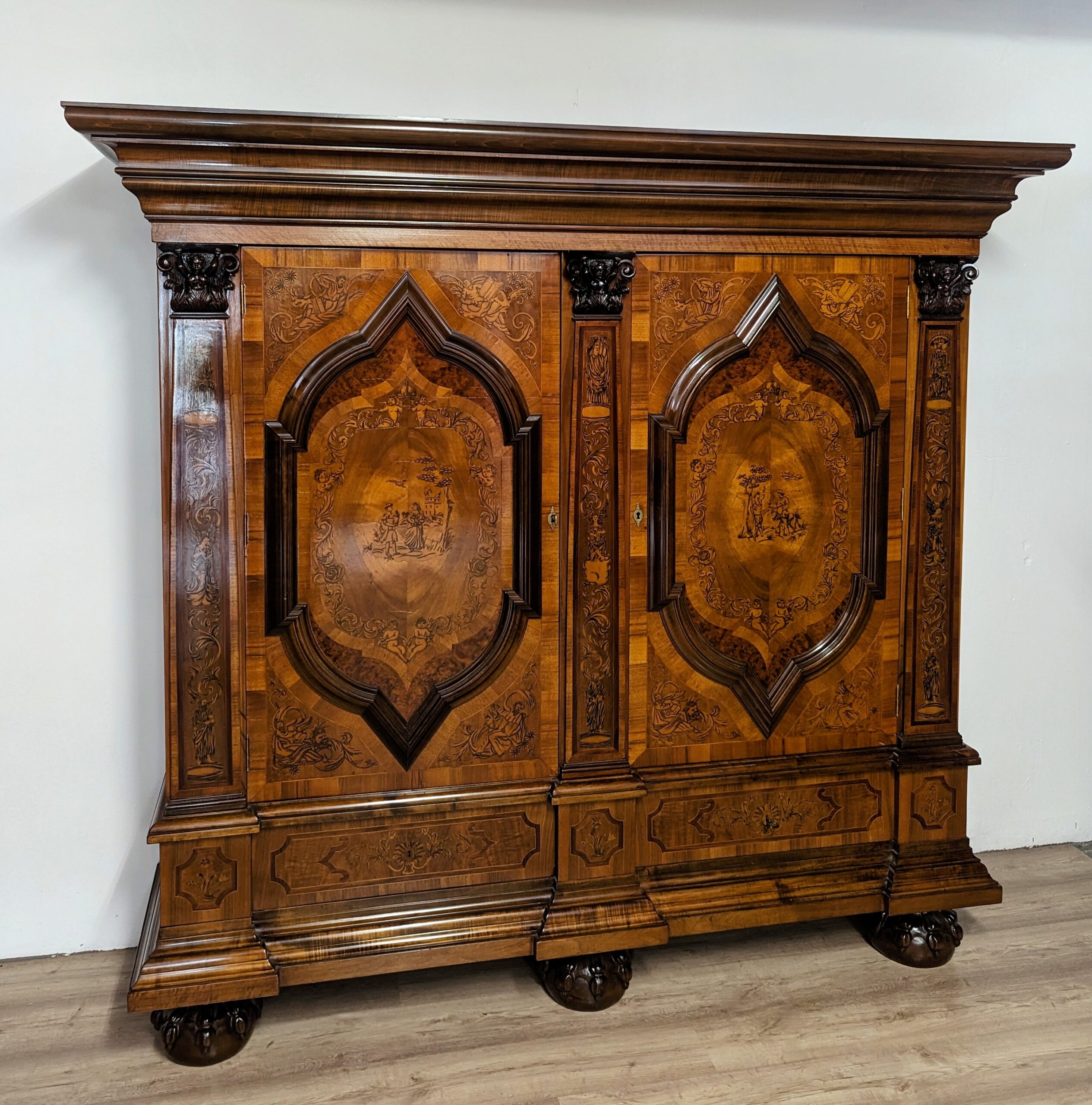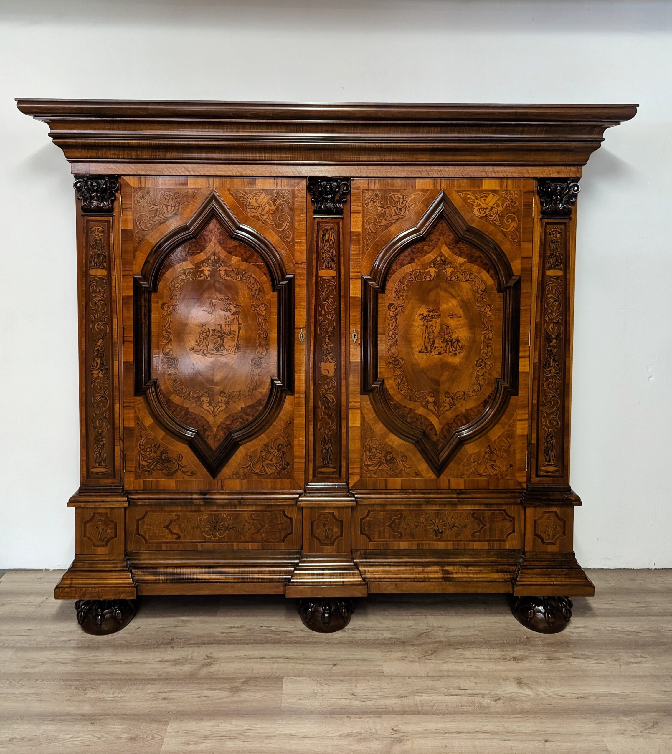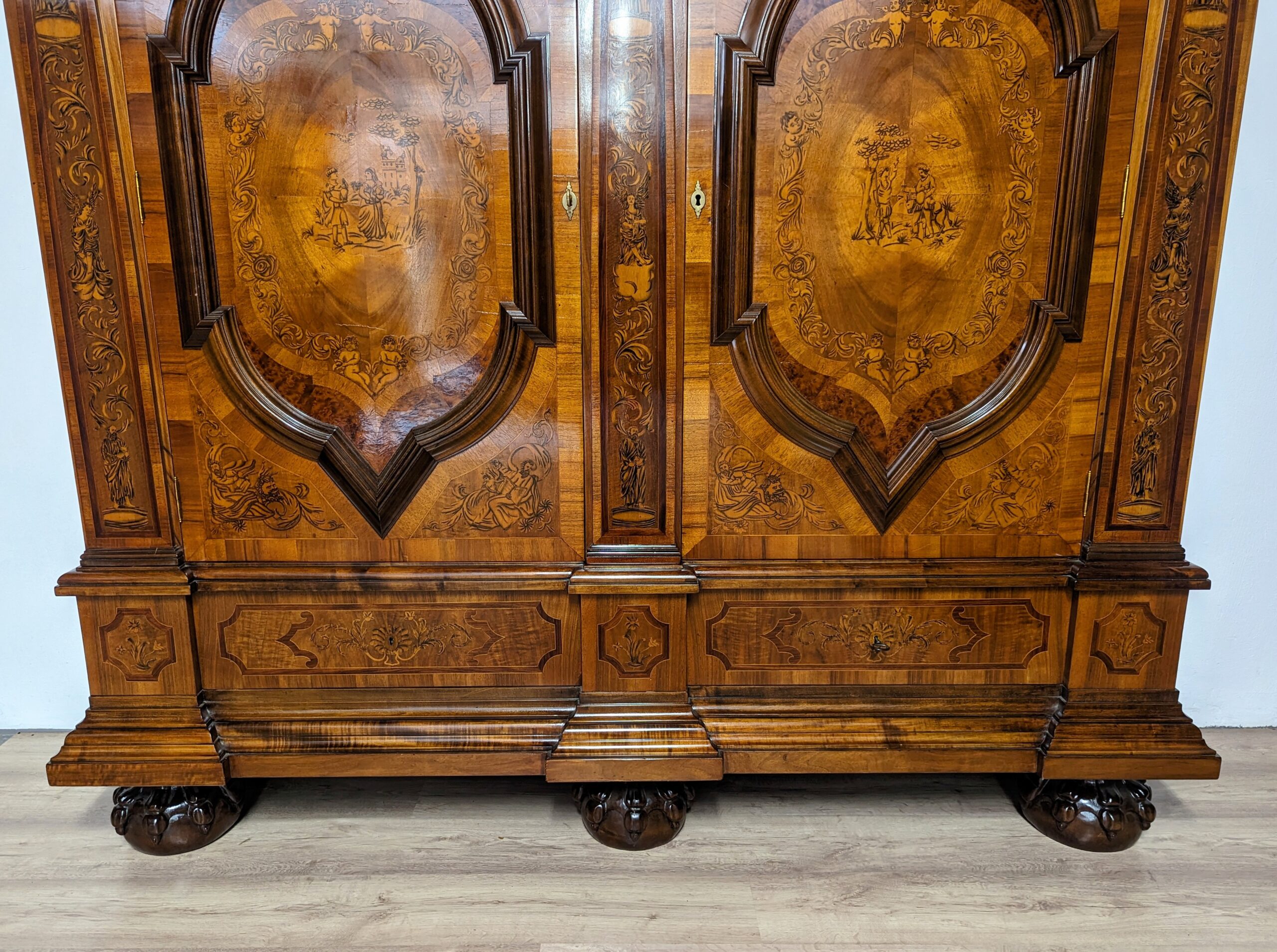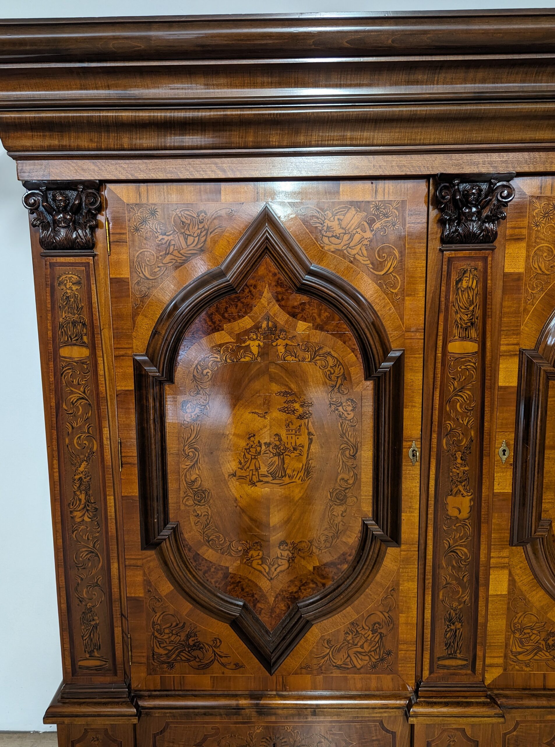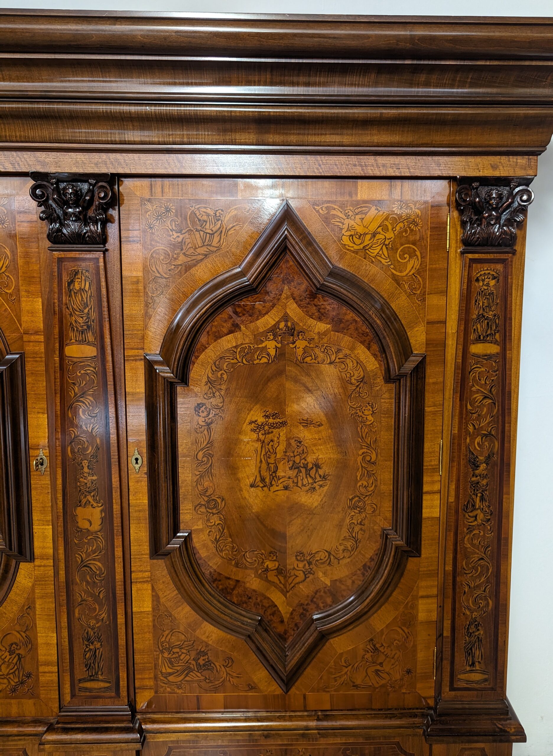 Der Schrank besitzt schöne Brandmalereien und Intarsien.