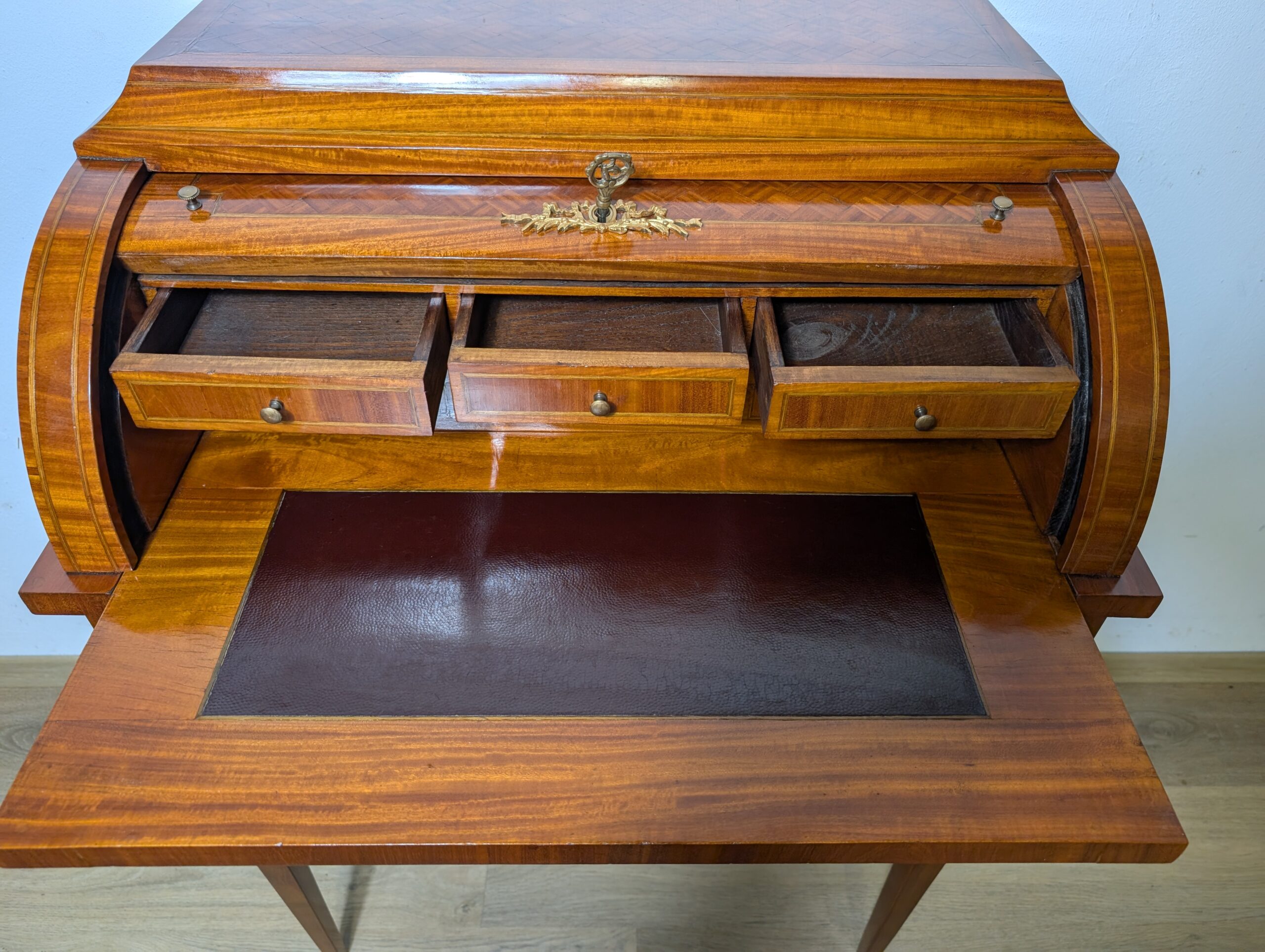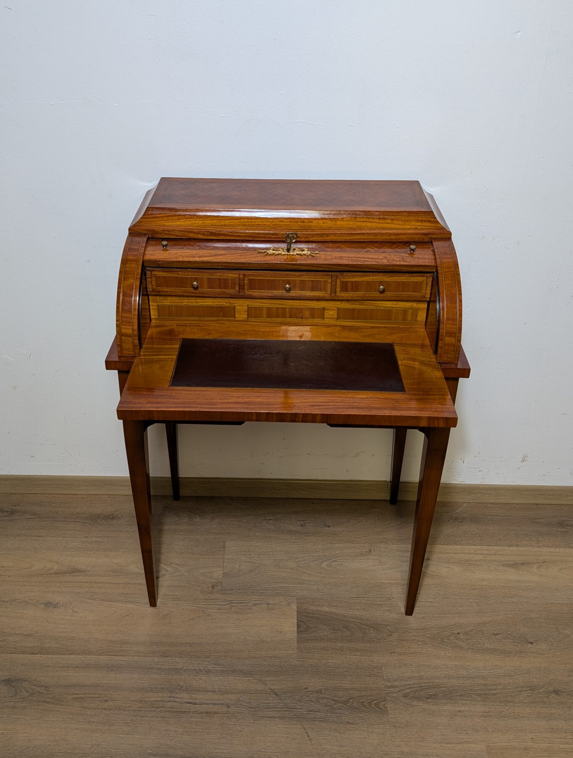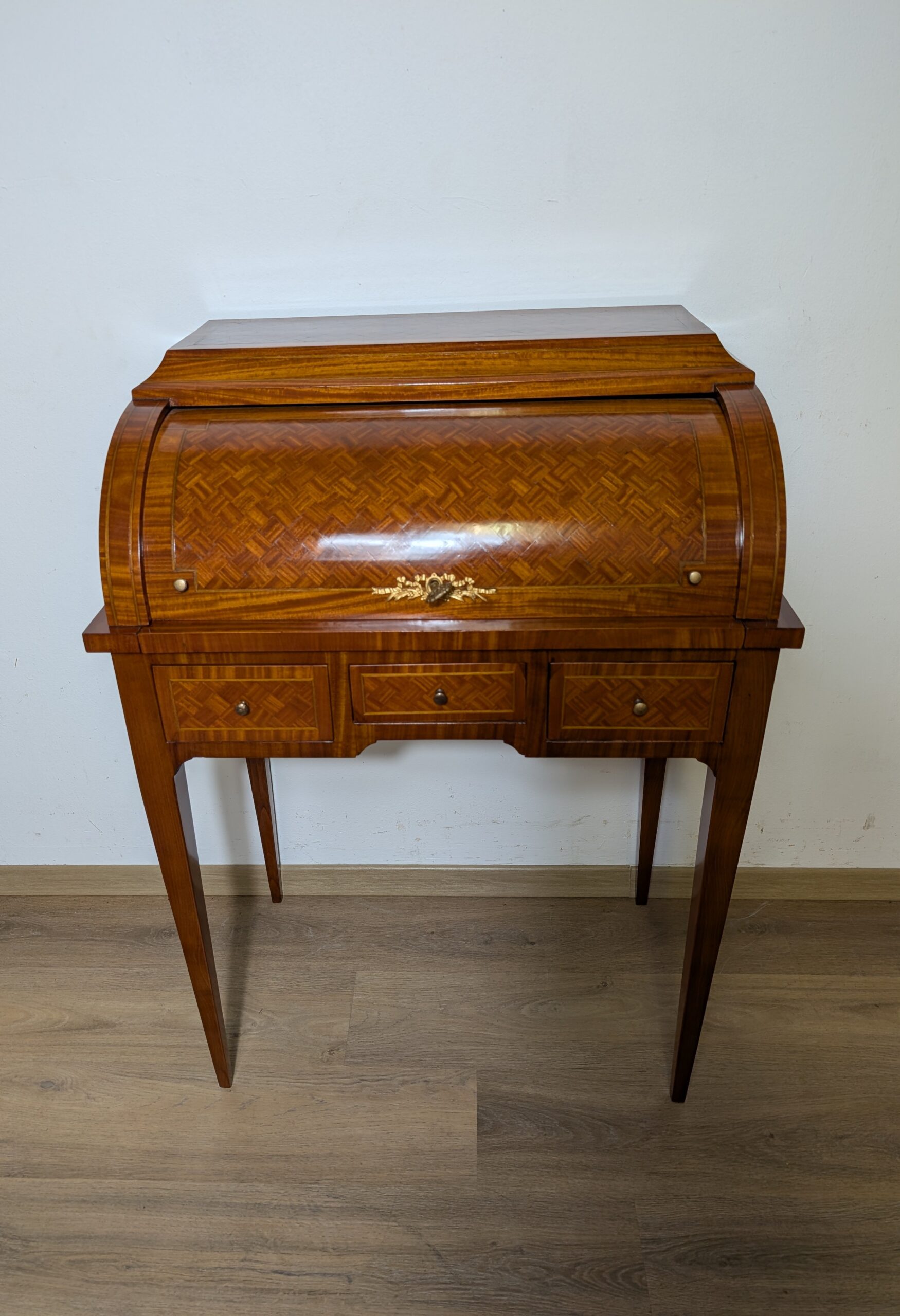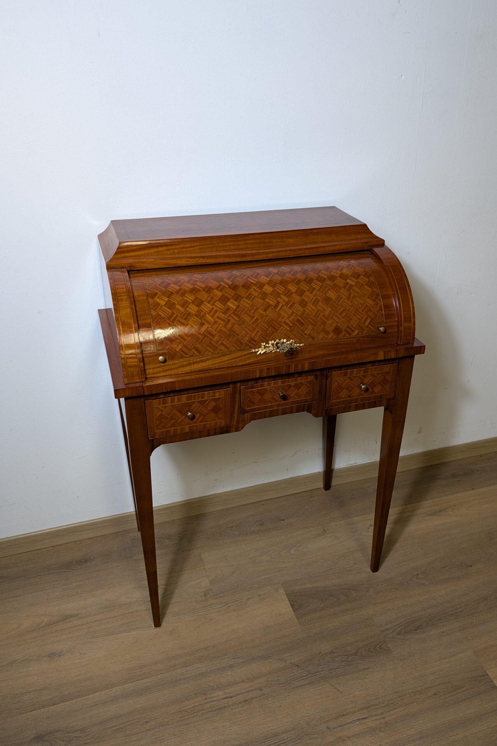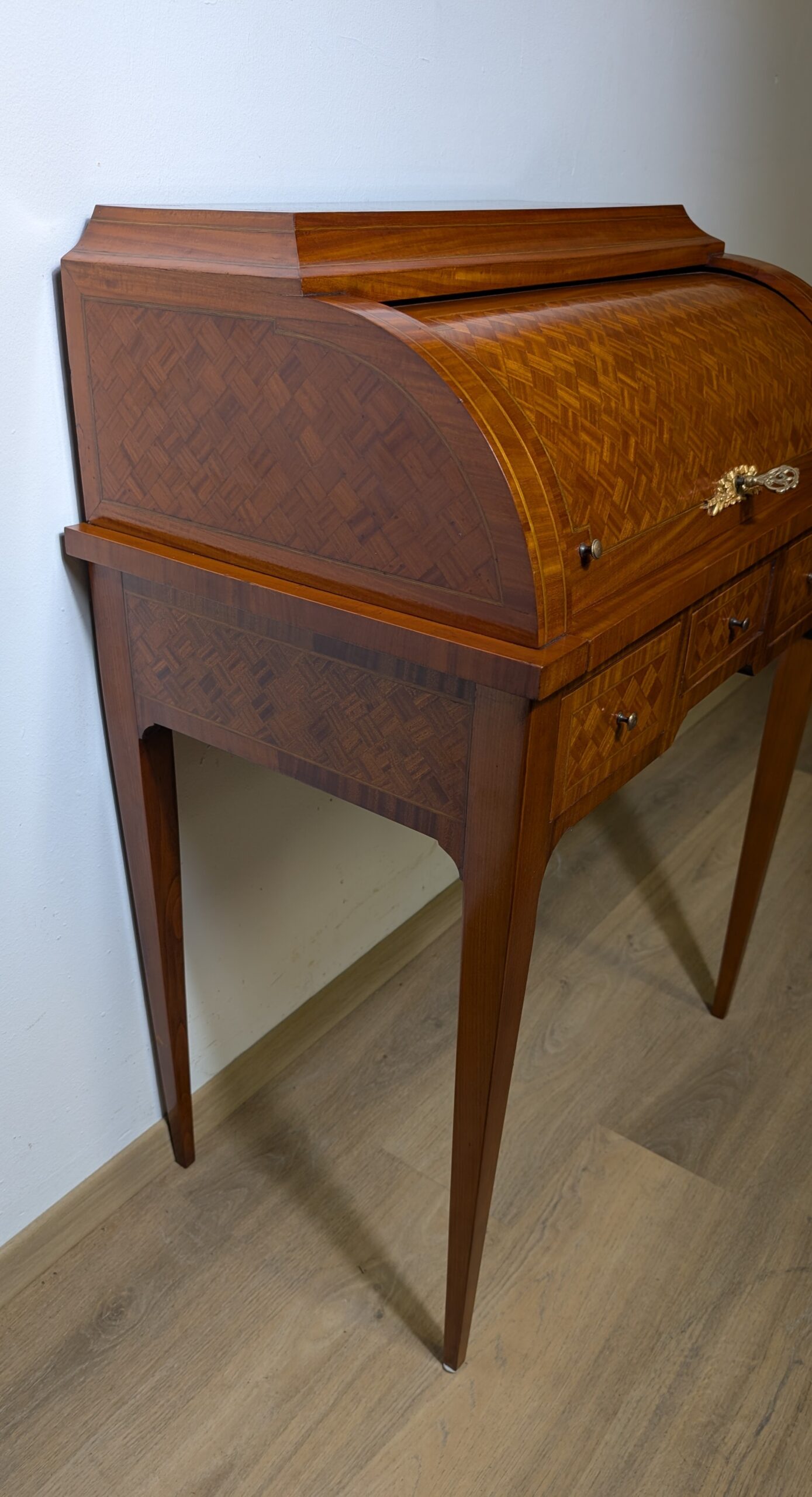 Unterhalb der Rolllade befinden sich drei kleine Schubladen mit passenden Knäufen, die sowohl dekorativ als auch funktional sind. Der Schreibtisch steht auf vier schlanken, leicht ausgestellten Beinen, die dem Möbel eine leichte und elegante Erscheinung verleihen.