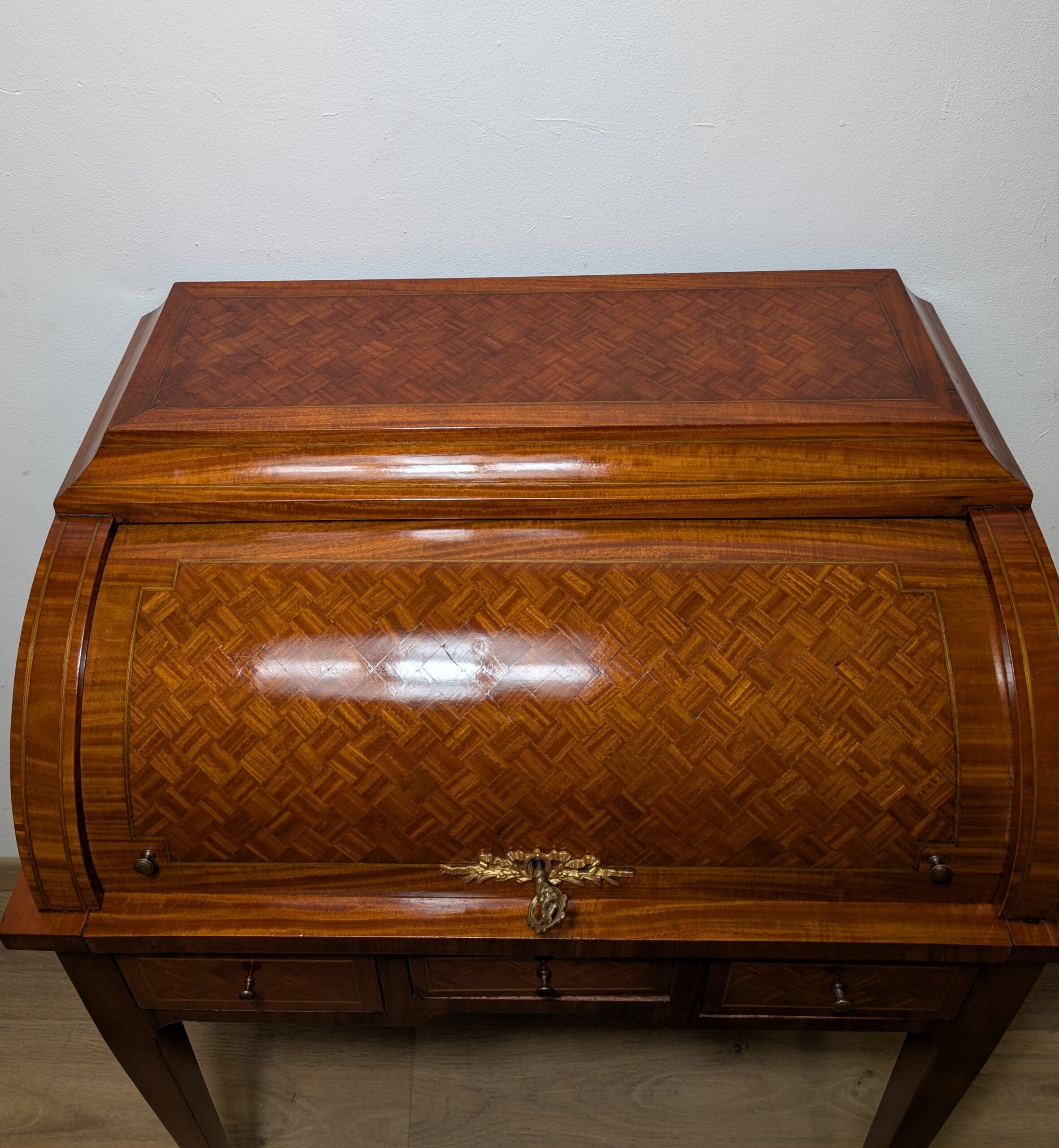 Dieses elegante Möbelstück ist ein antiker Rolltop-Schreibtisch, auch bekannt als Zylinderbureau. Es ist aus edlem Holz gefertigt und besticht durch seine aufwendige Intarsienarbeit im Fischgrätmuster auf der gewölbten Rollladenklappe sowie den Schubladenfronten. Die Oberfläche ist hochglanzpoliert, was die Holzmaserung besonders zur Geltung bringt.