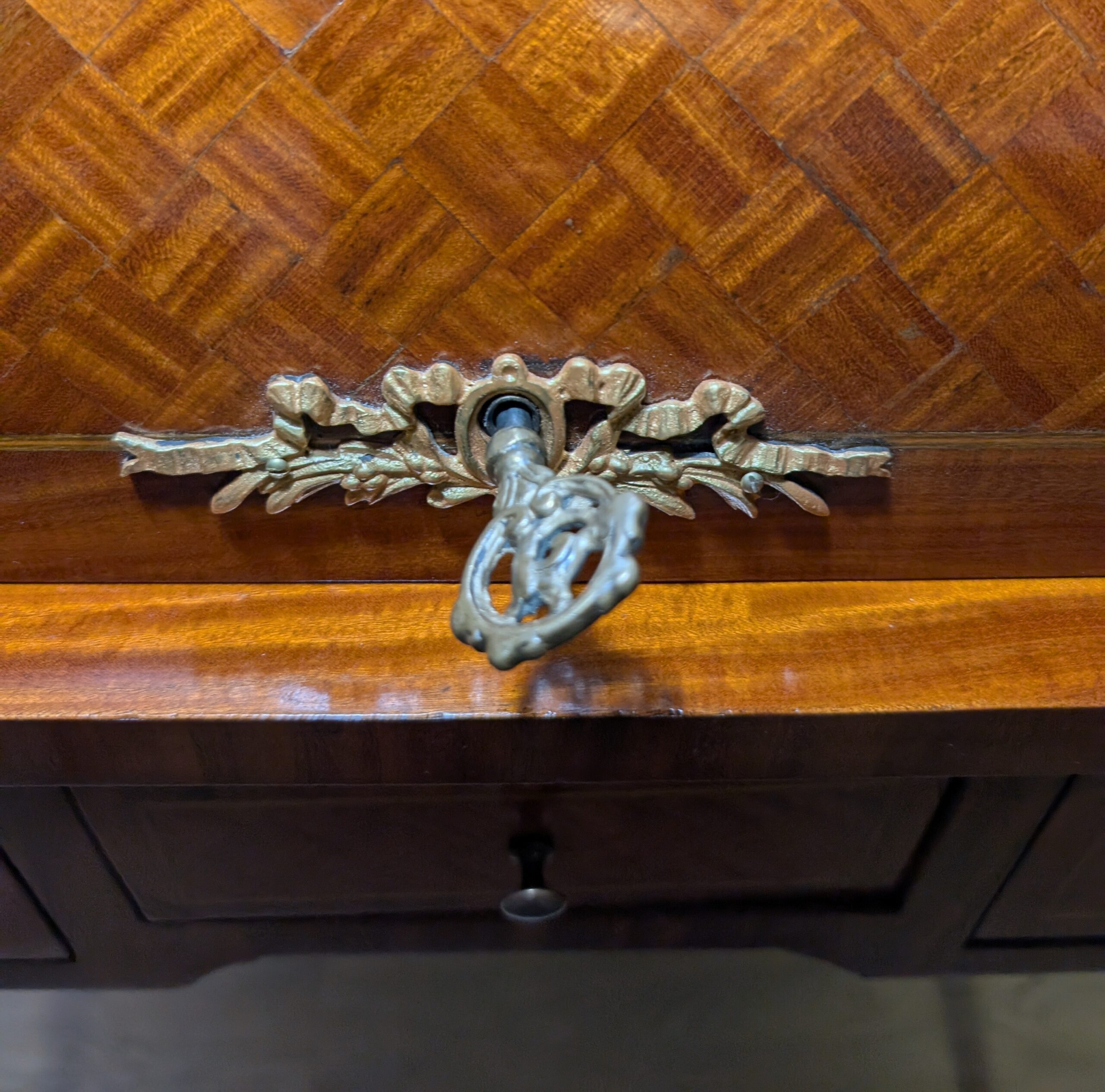 Das obere Element des Schreibtischs besteht aus einer halbrunden Rollladenklappe, die sich vermutlich nach hinten öffnen lässt, um den Innenraum mit Schreibfläche und Fächern freizugeben. Besonders hervorzuheben ist das kunstvoll gestaltete, vergoldete Zierornament in der Mitte der Rolllade, das dem Möbelstück einen zusätzlichen Hauch von Noblesse verleiht.