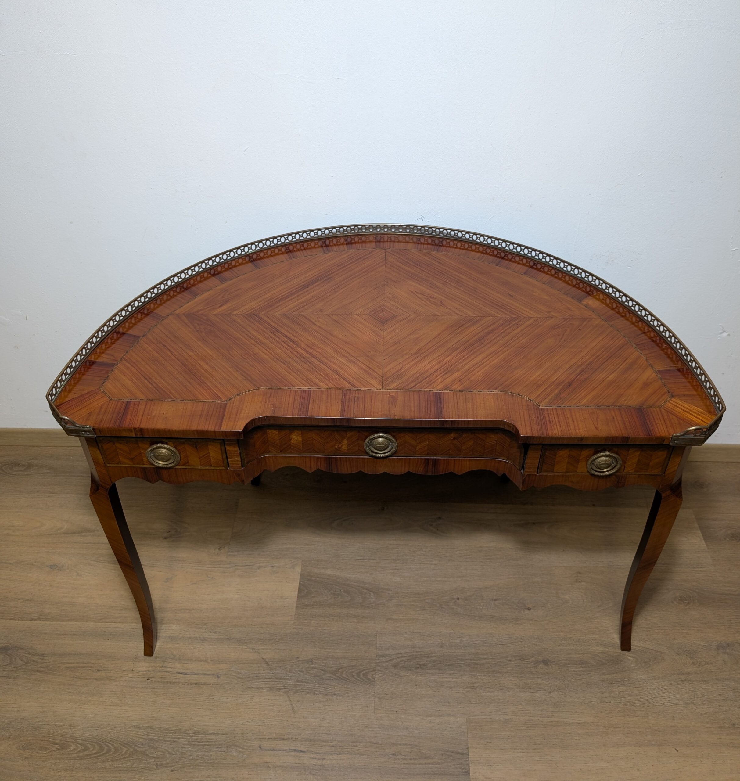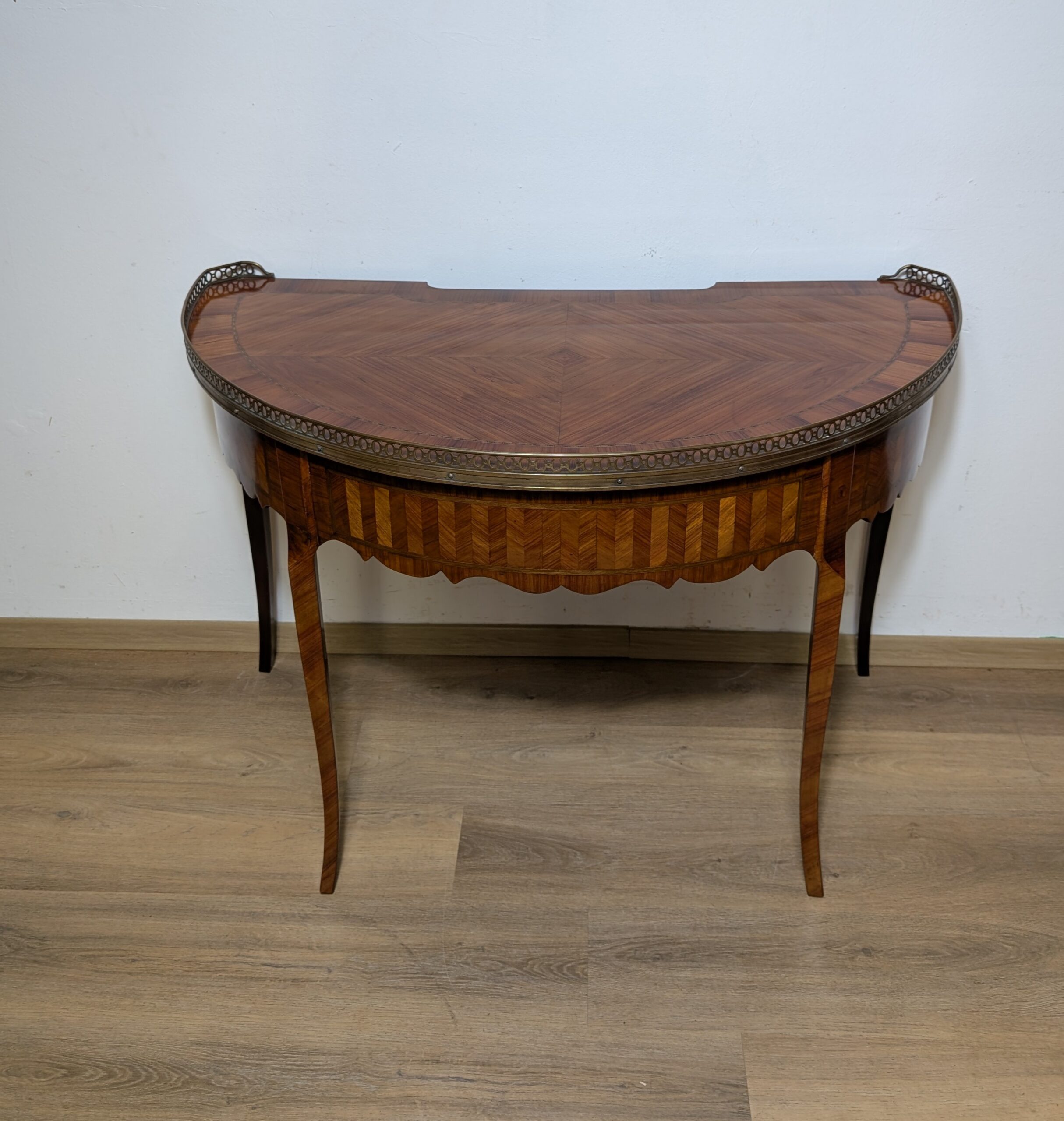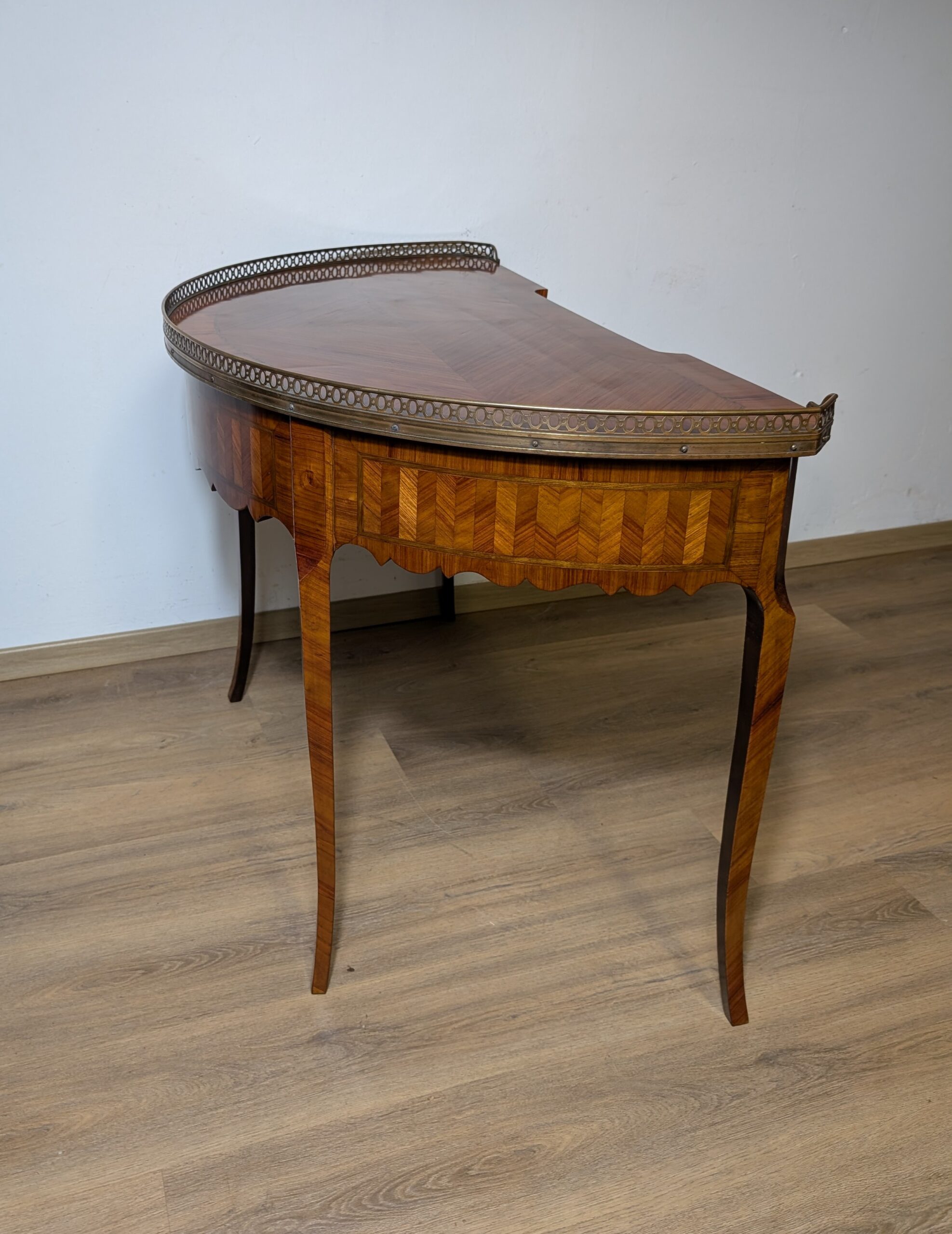 Dieses stilvolle Möbelstück ist ein antiker Konsolentisch oder Damen-Schreibtisch im Louis XV- oder Louis XVI-Stil, erkennbar an seinen eleganten geschwungenen Beinen und der kunstvollen Intarsienarbeit. Die halbrunde, leicht geschwungene Form der Tischplatte mit fein gearbeiteter Bronzegalerie am Rand deutet auf französischen Einfluss hin.