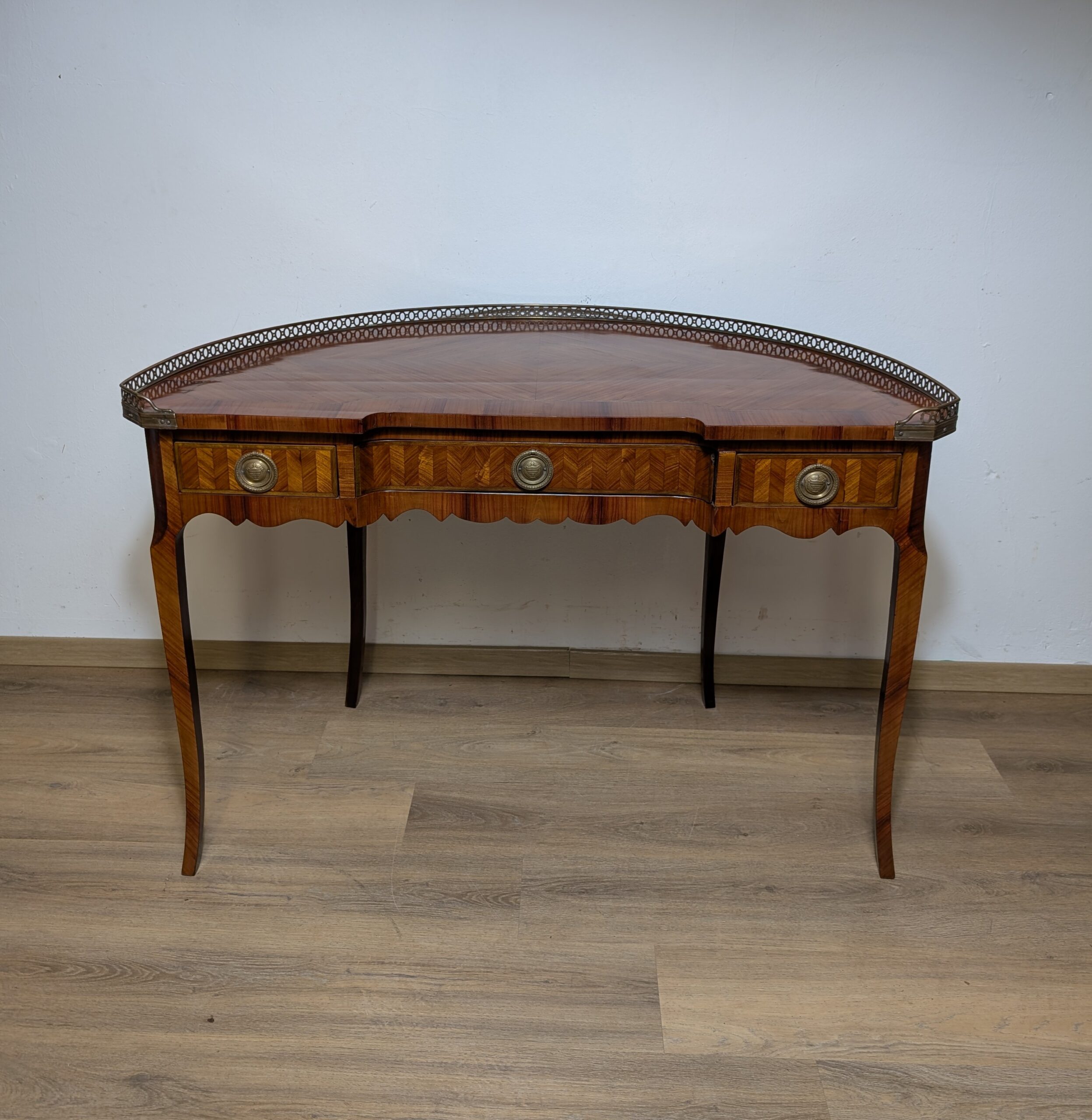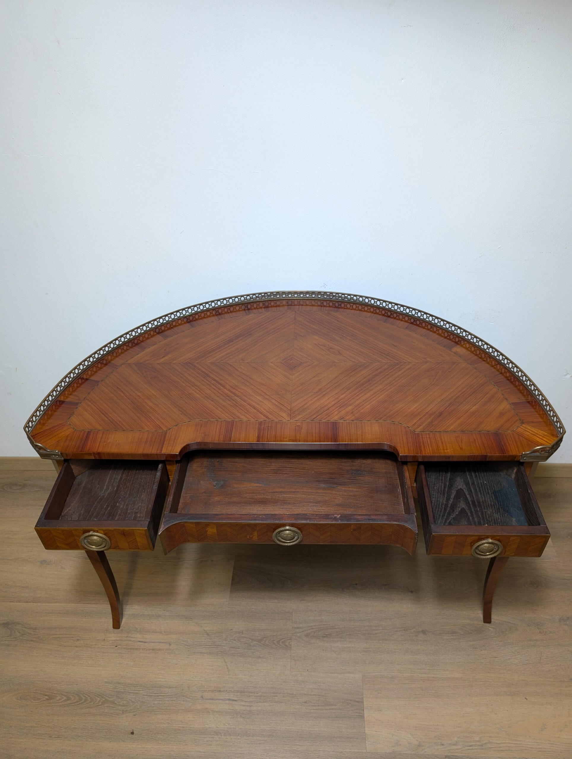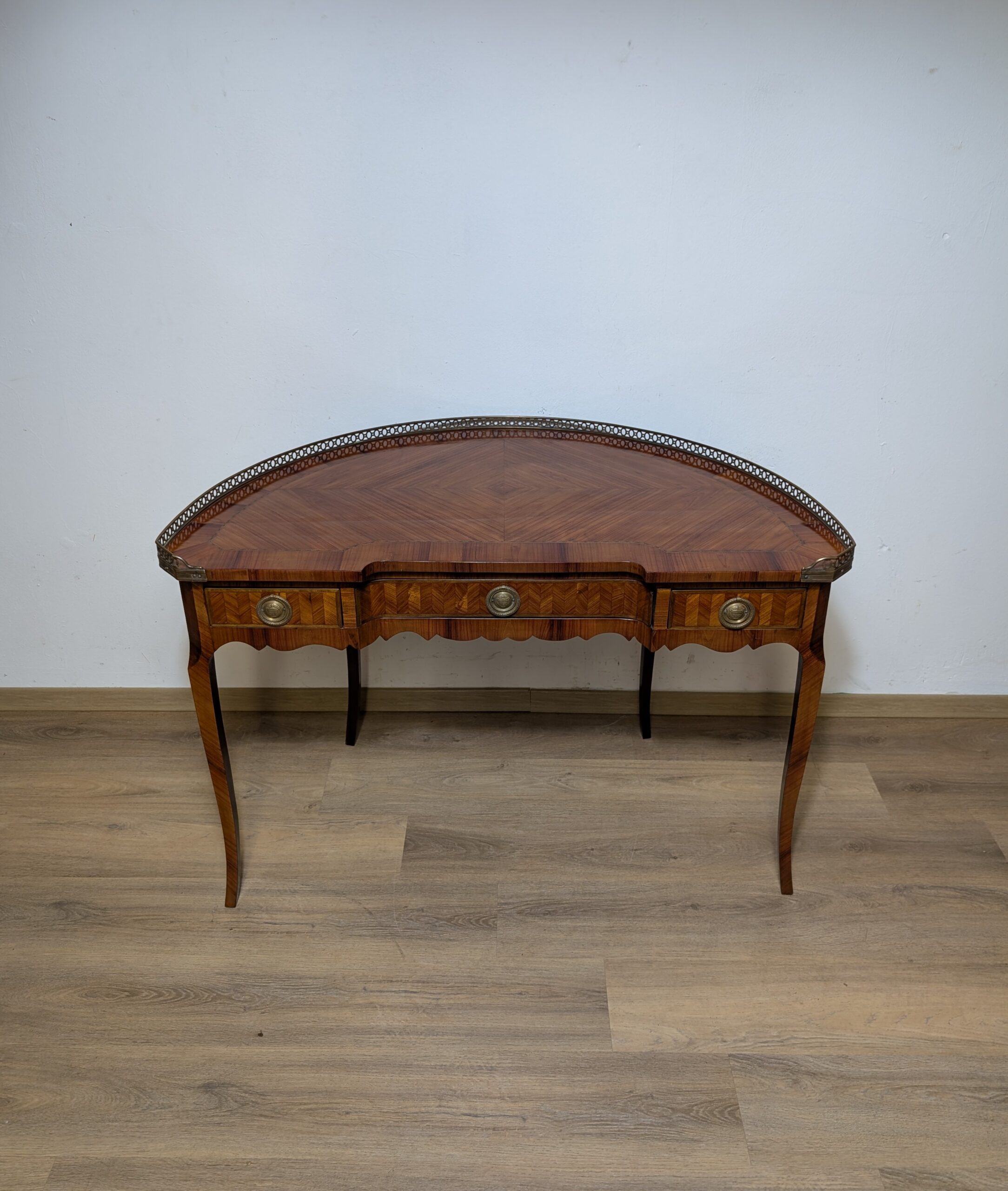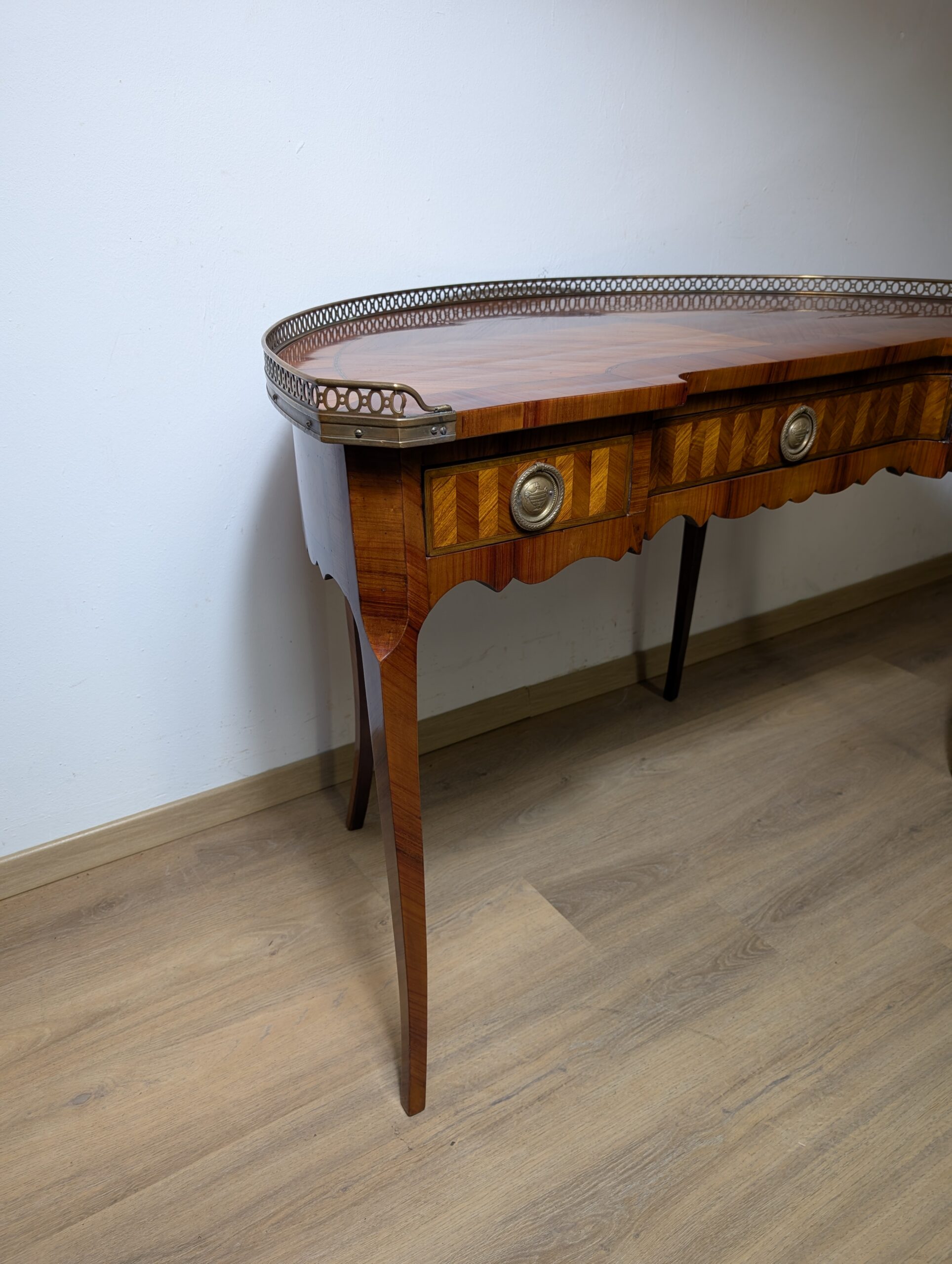 Dieses stilvolle Möbelstück ist ein antiker Konsolentisch oder Damen-Schreibtisch im Louis XV- oder Louis XVI-Stil, erkennbar an seinen eleganten geschwungenen Beinen und der kunstvollen Intarsienarbeit. Die halbrunde, leicht geschwungene Form der Tischplatte mit fein gearbeiteter Bronzegalerie am Rand deutet auf französischen Einfluss hin.