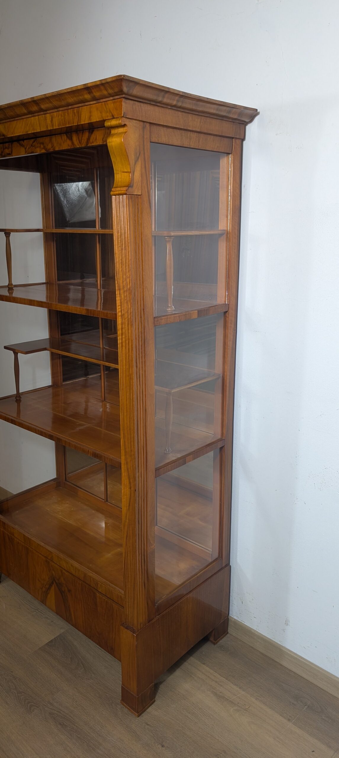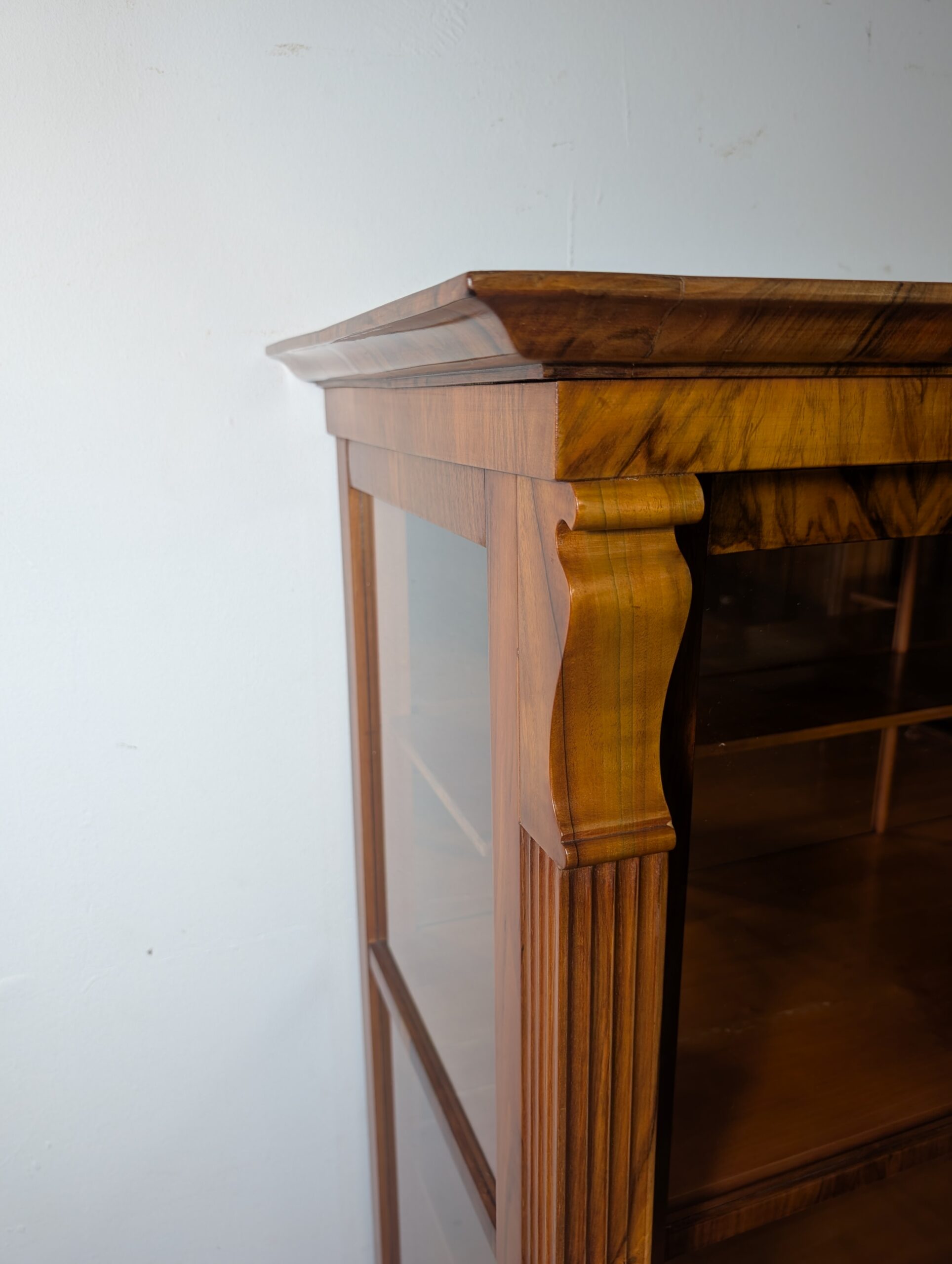 Nussbaum furniert mit Glaseinsätzen und einer Schublade